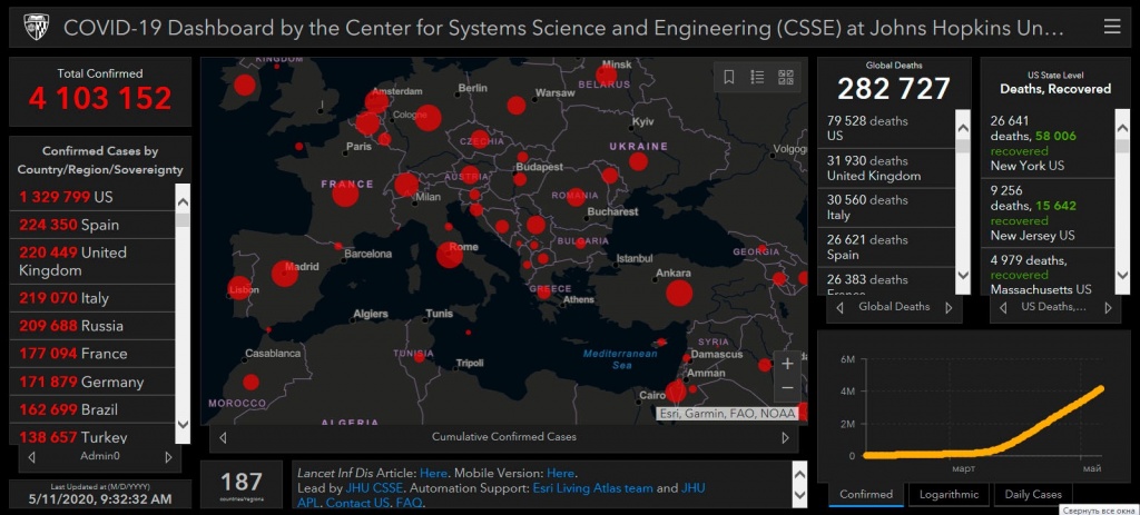 Ценность и полезность карт во время кризиса вновь была продемонстрирована, почти в одночасье во время нынешней пандемии, поскольку карты помогают разобраться в миллионах случаев заражения COVID-19 по всему миру. Ярким примером являются превосходные карты, публикуемые Университетом Джона Хопкинса (рис. 4). Эти карты были разработаны в январе 2020 г. для обеспечения ежедневного обзора общего числа подтвержденных случаев COVID-19, общего числа смертей, выздоровления и других данных. Многие СМИ используют эти карты в своих репортажах. Количество посещений сайта превышает 1 миллиард, что доказывает, что карты по-прежнему являются важнейшим и наглядным источником информации.