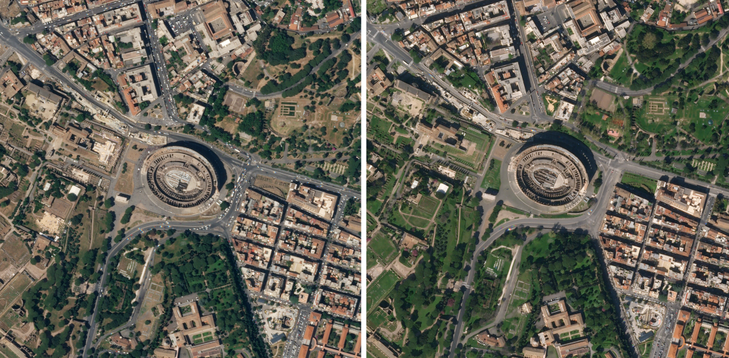 Типичная очередь, которая формируется на въезде к Колизею в Риме, отсутствовала на этом снимке SkySat с 6 апреля 2020 года (справа). По сравнению с 5 июля 2019 года движение на близлежащих улицах было значительно сокращено (слева)