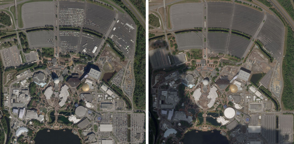 Epcot Center в Bay Lake Florida 6 января 2020 года (слева) полон автомобилей посетителей парка. Поскольку меры безопасности COVID-19 были введены компанией Walt Disney Co. 18 марта 2020 года, паркинги стали пустыми (справа)