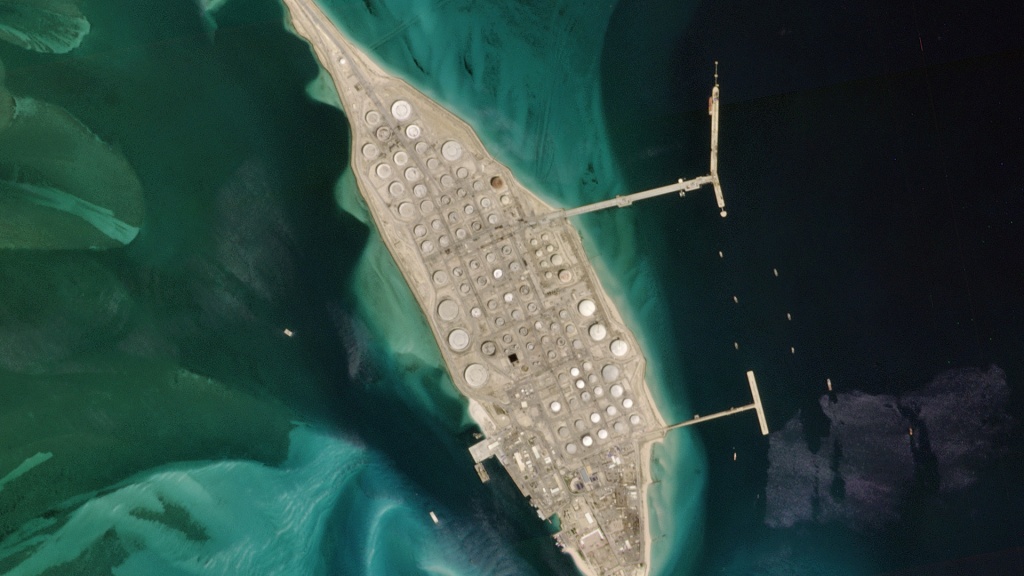 Снимок Planet хранилища сырой нефти Saudi Aramco в Рас Танура, Саудовская Аравия